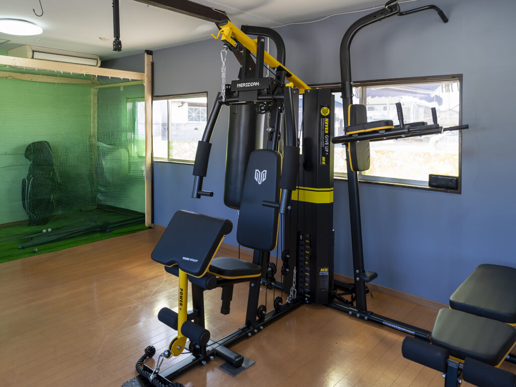 多機能マシンで全身を効率よく鍛えられるジム設備。コンパクト設計で幅広いトレーニングに対応。